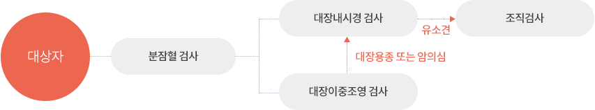 - 만 50세 이상 남녀는 1년마다 분변잠혈분변잠혈검사(FOBT)를 받은 후 양성판정자는 대장내시경 검사를 받습니다.