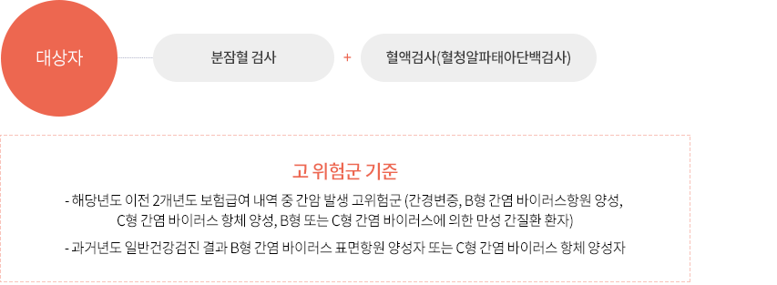 - 만 40세 이상 남녀 중 간암발생 고위험군에 해당되는 아래 대상자는 상반기1회, 하반기1회로 6개월마다 간 초음파검사와